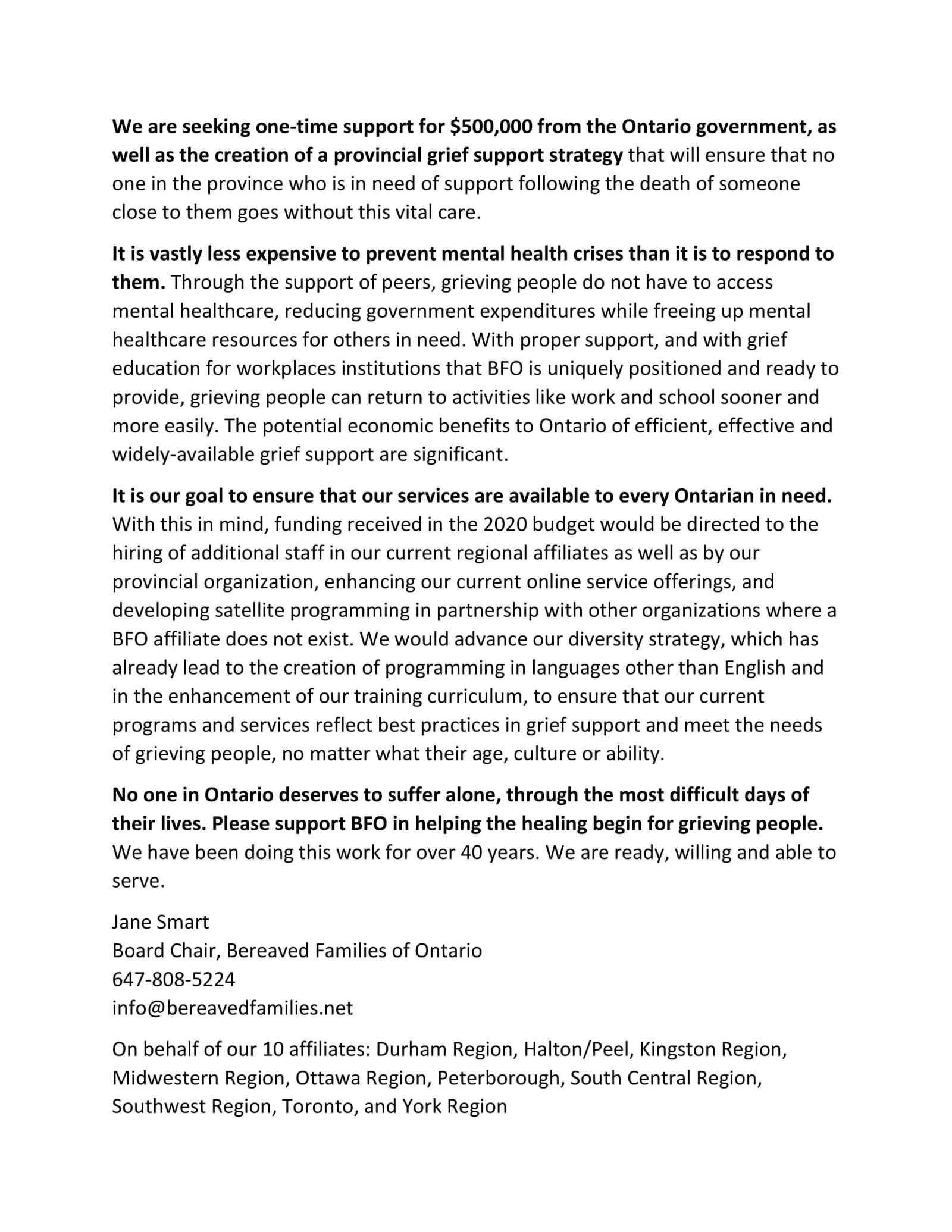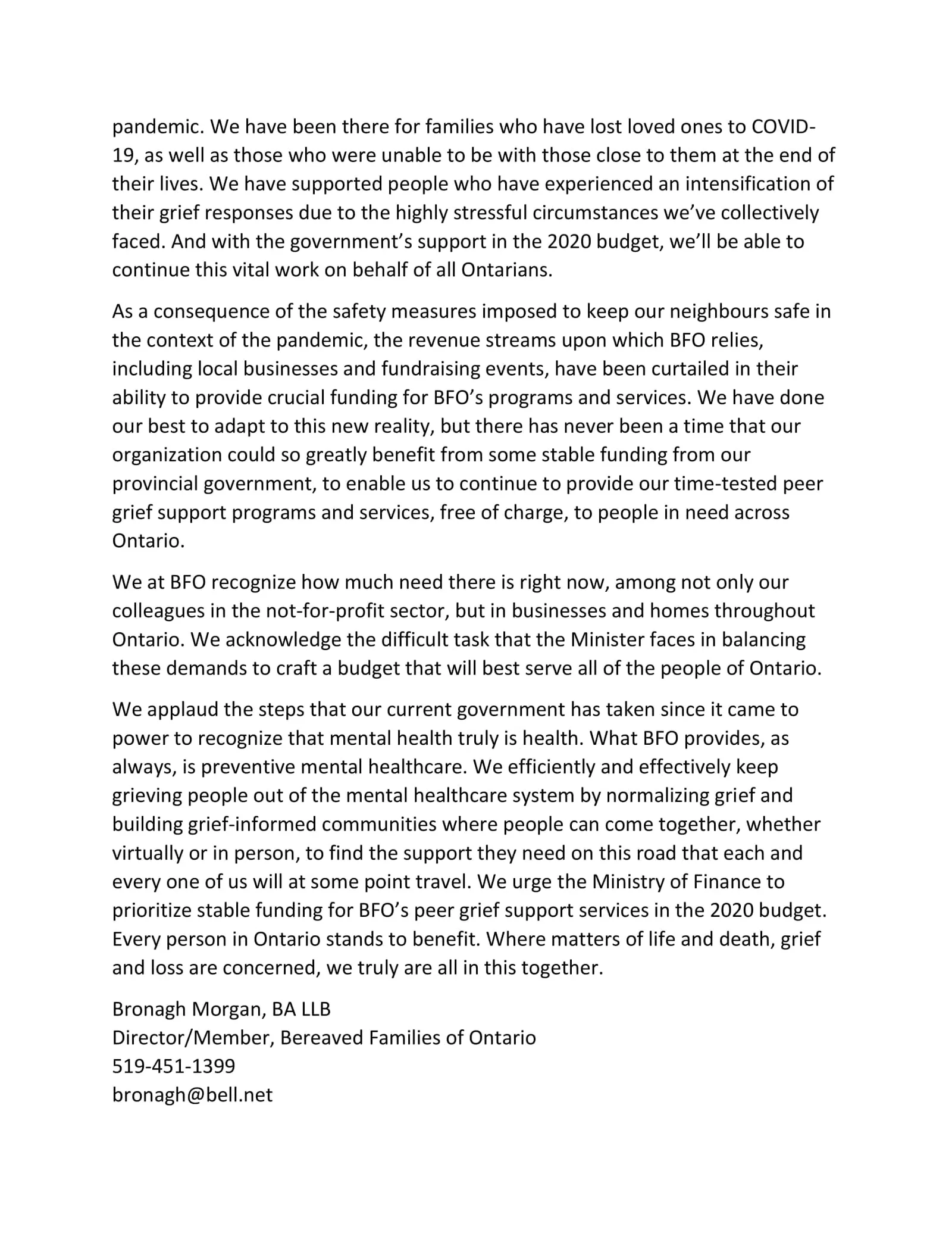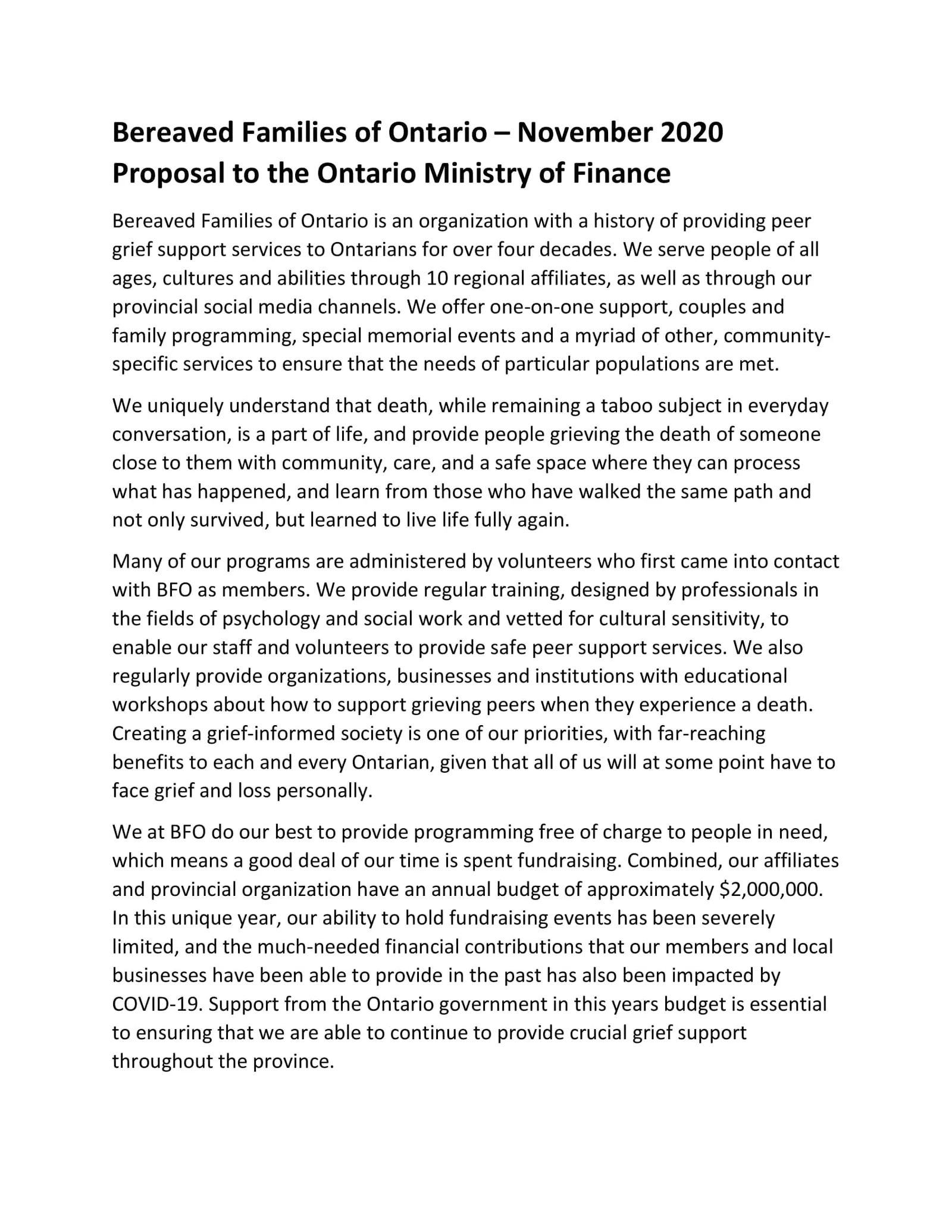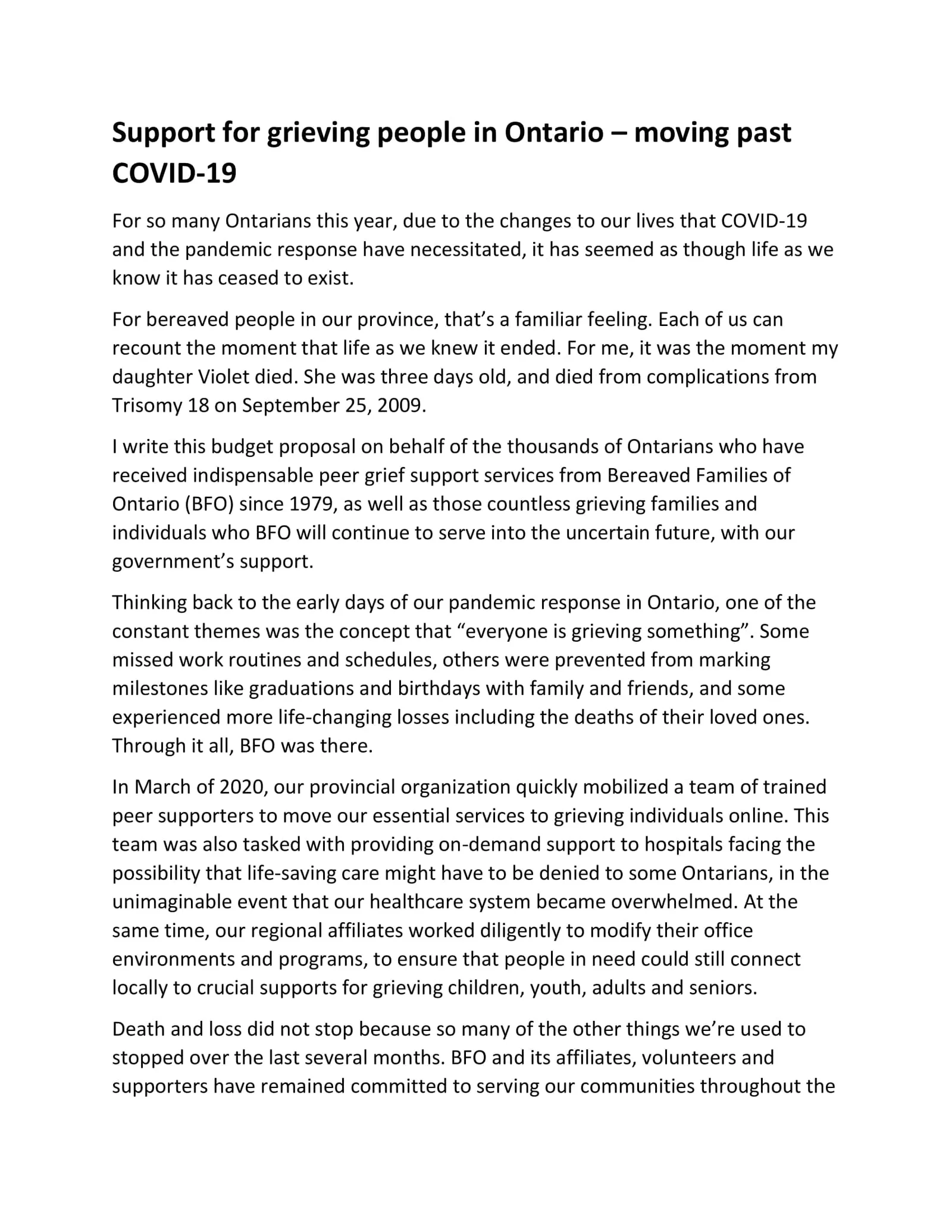 As a resident of your riding, I am writing to ask for your support on behalf of Bereaved Families of Ontario –Ā Durham RegionĀ https://bfodurham.aawsai.com/, a local, not-for-profit organization that provides peer support to individuals following the death of a loved one.